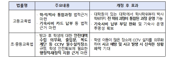 이를 통해 학교장이 시행하는 안전대책 사항에 ‘방과 후 학교에 남아 교육 및 돌봄에 참여하는 학생에 대한 안전 확보에 관한 사항’을 포함하고, ‘출입문, 복도, 계단 등 대통령령으로 정하는 필수 설치 장소’에 학교 내 영상정보처리기기(CCTV)를 설치하도록 의무화한다. 개정 이후 학교에서의 사고 예방 및 사고 발생 시 신속한 상황 파악이 가능할 것으로 기대된다.