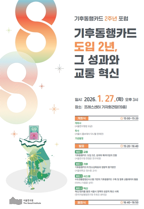 [뉴스앤톡] 서울연구원은 27일 오후 3시, 한국프레스센터 기자회견장에서 '기후동행카드 도입 2년, 그 성과와 교통 혁신'을 주제로 기후동행카드 2주년 정책 포럼을 개최한다.
