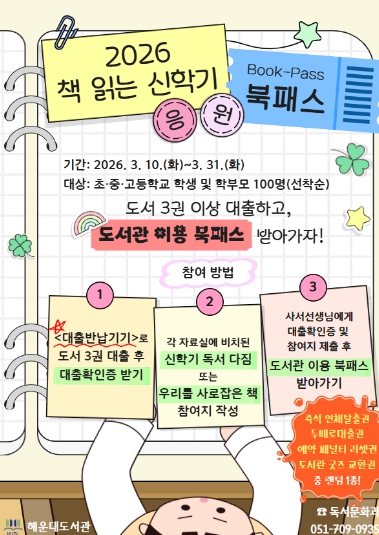 [뉴스앤톡] 부산광역시립해운대도서관(관장 노장석)은 오는 10일부터 31일까지 초·중·고등학교 학생 및 학부모 100명을 대상으로 ‘2026 책 읽는 신학기 응원 북패스’ 행사를 운영한다.