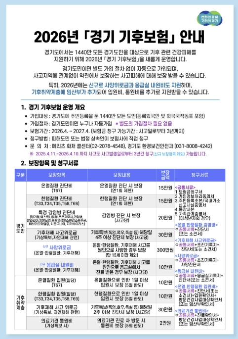 ‘경기 기후보험’은 동두천 시민을 포함해 경기도에 주민등록을 둔 도민이라면 별도 가입 절차 없이 자동으로 가입되며, 폭염과 한파 등 기후재난으로 인한 피해를 보장하는 제도다. 특히 사고 발생 지역과 관계없이 약관상 보장 범위에 해당하면 보험 혜택을 받을 수 있다는 점이 특징이다.