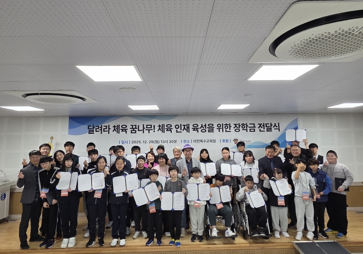 [뉴스앤톡] 대전특수교육원은 12월 29일 본원과 한밭수목원 엑스포시민광장에서 장애학생 육상 종목 특기생과 미래 육상 꿈나무 63명을 대상으로 (재)조웅래나눔재단(이사장 조웅래)으로부터‘체육(육상) 종목 미래인재 장학금 전달식 및 달리기 행사’를 개최하고, 장학증서를 수여했다