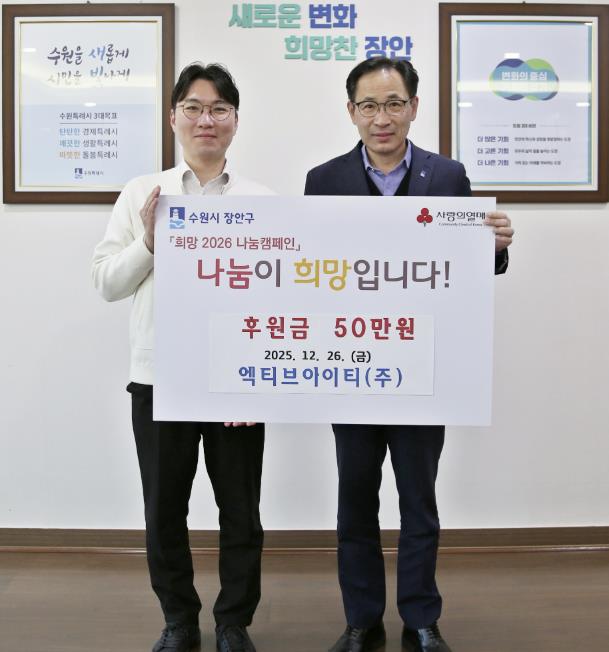 [뉴스앤톡] 수원시 장안구는 지난 26일 송죽동 소재 엑티브아이티(주)가 기부금 50만 원을 전달했다고 밝혔다. 이번 기부는 장안구 관내 어려운 이웃을 돕기 위한 것으로, 지역사회에 온정을 나누는 뜻깊은 자리다.