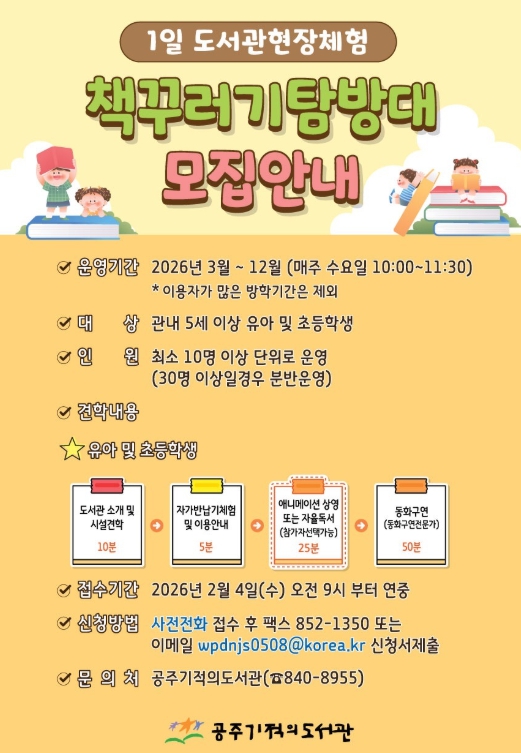 [뉴스앤톡] 공주시는 오는 3월부터 12월까지 지역 어린이들을 대상으로 1일 도서관 현장체험 프로그램 ‘책꾸러기탐방대’를 운영한다고 밝혔다.