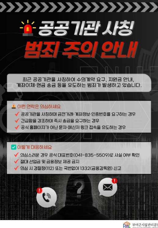 [뉴스앤톡] 부여군시설관리공단은 최근 공공기관을 사칭해 물품 대리구매나 수의계약을 가장하고 선입금을 요구하는 사기 시도가 발생하고 있다며, 관내 업체와 협력사를 대상으로 각별한 주의를 당부했다.