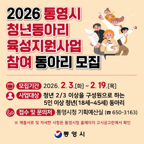 이번 사업은 통영시에 거주하거나 생활권 내 대학 및 사업장에서 활동하는 18세 이상 45세 이하의 청년을 대상으로, 동아리 활동에 필요한 지원금을 제공하는 프로그램이다.