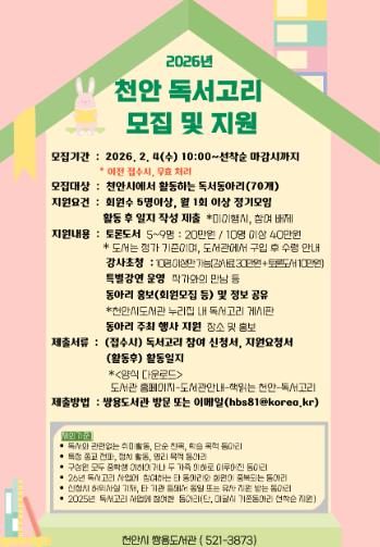 도서관 관계자는 “독서동아리는 시민이 주체가 되어 만들어 가는 생활 밀착형 독서문화”라며 “앞으로도 시민들의 자발적인 독서활동이 지속될 수 있도록 다양한 지원을 이어갈 것”이라고 말했다.