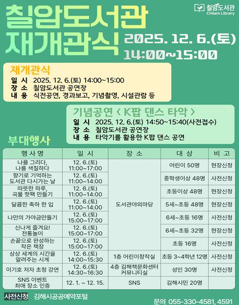 [뉴스앤톡] 김해시 칠암도서관이 오는 6일 도서관 공연장에서 재개관식을 개최한다고 2일 밝혔다.