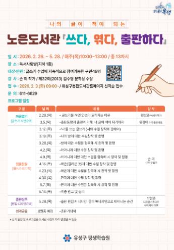 정용래 유성구청장은 “이번 프로그램이 주민의 자기표현 역량과 글쓰기 능력 향상에 도움이 되길 바란다”라며 “도서관이 단순히 책을 읽는 공간이 아닌 생활 문화 거점으로 자리 잡을 수 있도록 지원하겠다”라고 말했다.