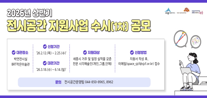 [뉴스앤톡] 세종시문화관광재단은 2월 12일부터 2월 25일까지 지역 시각예술인의 창작활동을 지원하고 시민들에게 다양한 전시를 선보이기 위한 ‘2026년 상반기 전시공간 지원사업 수시(1차)’ 공모를 진행한다.
