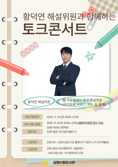 [뉴스앤톡] 김제시립도서관은 오는 14일 금요일 19시부터 도서관 5층 배움터 3에서 ‘황덕연 해설위원과 함께하는 토크콘서트 내 꿈을 읽는 도서관’을 진행한다고 밝혔다