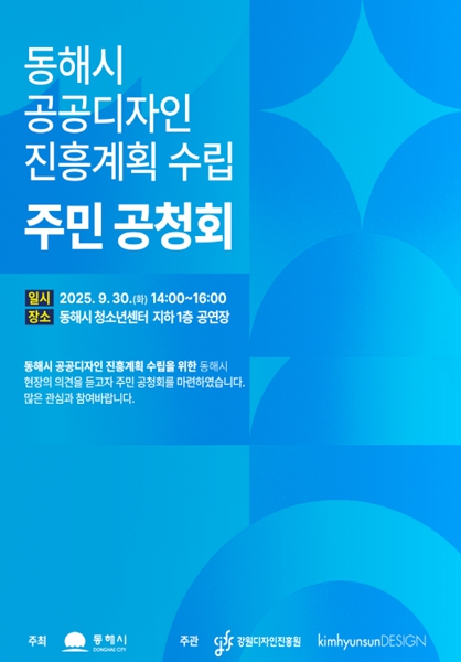 [뉴스앤톡] 동해시는 시민과 함께하는 열린 정책 수립을 위해 '동해시 공공디자인 진흥계획(안)' 공청회를 오는 9월 30일 오후 2시, 동해시 청소년센터 1층 공연장에서 개최한다고 밝혔다.