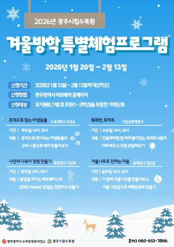 [뉴스앤톡] 광주광역시 시립수목원은 어린이를 위한 ‘2026년 겨울방학 체험 프로그램’ 참가자 640명을 오는 13일 오전 10시부터 선착순 모집한다.