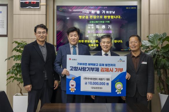 [뉴스앤톡] 김제시는 2일 ㈜우석이엔씨 최용기 회장이 김제시 고향사랑기부제에 1,000만원을 기탁했다고 밝혔다.