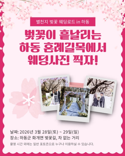 [뉴스앤톡] 하동군은 오는 3월 27일부터 29일까지 열리는 ‘제27회 화개장터 벚꽃축제’를 앞두고, 특별한 웨딩 촬영 이벤트의 참가 신청을 받는다고 밝혔다.