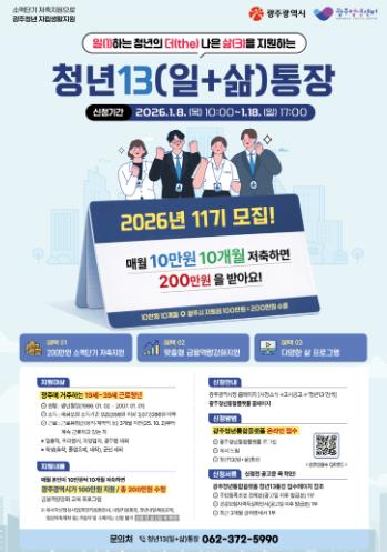 [뉴스앤톡] 광주광역시는 일(1)하는 청년의 더 나은 삶(3)을 지원하는 ‘청년13(일+삶)통장’ 제11기 참여자를 8일부터 18일까지 모집한다.