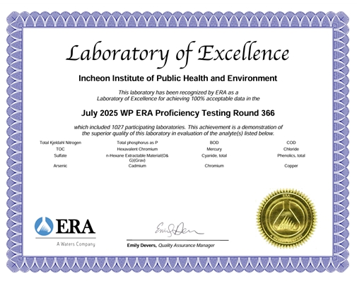 [뉴스앤톡] 인천광역시 보건환경연구원은 미국 환경자원협회(ERA)가 주관한 2025년 환경분야 국제숙련도 평가에서 ‘최우수 등급(Laboratory of Excellence)’을 받았다고 밝혔다.