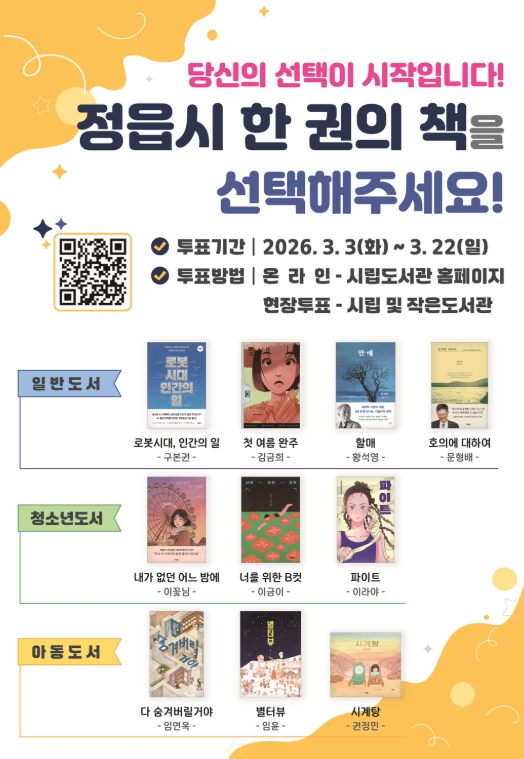 [뉴스앤톡] 정읍시가 시민이 함께 읽고 공감하는 독서문화 확산을 위해 2026년 ‘한 권의 책’ 선정을 위한 시민 투표를 오는 22일까지 온·오프라인으로 실시한다.