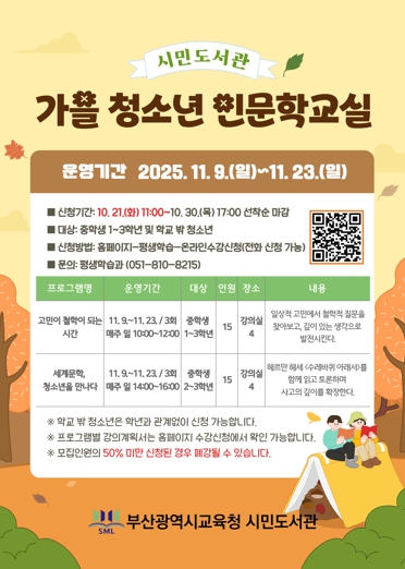 | ▲ 부산시민도서관, ‘가을 청소년 인문학교실’운영 |