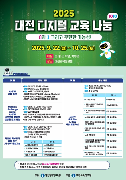 [뉴스앤톡] 대전교육정보원은 ‘0과 1 그리고 무한한 가능성’을 주제로 ‘2025년 대전 디지털 교육 나눔1010’ 행사를 9월 22일부터 10월 28일까지 5주간 초·중·고 학생, 교원, 학부모를 대상으로 다채로운 온·오프라인 프로그램을 기획하여 성황리에 운영했다고 밝혔다.