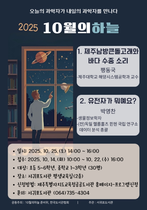 [뉴스앤톡] 제주도교육청 서귀포도서관은 25일 오후 2시부터 서귀포도서관 평생교육실에서 한국도서관협회 및 ‘10월의 하늘’ 준비위원회와 함께 ‘10월의 하늘’ 프로그램을 운영한다.