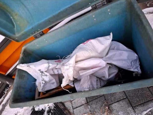 | ▲ 관내 한 제설함의 내부 모습(염화칼슘 포대가 일부 남아있으나 정돈되지 않은 채 방치되어 있고, 이미 개봉되어 굳어버린 듯한 모습도 관찰된다.) |