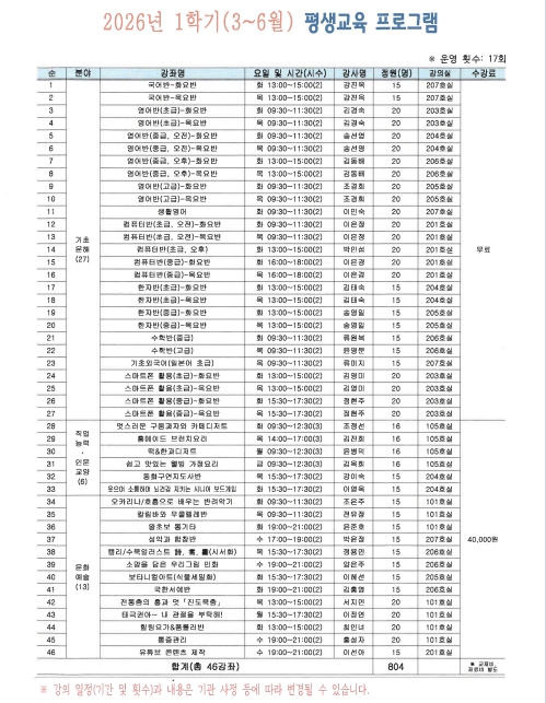 이번 학기에는 공모를 통해 선정된 46개 프로그램과 지역 우수강사의 재능을 활용한 12개 재능기부 프로그램 등 총 58개 강좌를 운영한다. 교육 과정은 영어 및 컴퓨터 등 기초문해 과정, 요리 및 동화구연지도사 등 직업능력·인문교양 과정, 통기타·민화·태극권 등 문화예술 과정으로 구성했다. 상반기 교육은 3월 3일부터 6월 29일까지 17주간 진행할 예정이다.