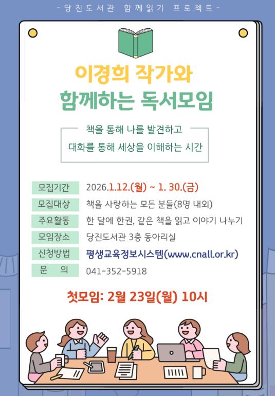 [뉴스앤톡] 당진교육지원청당진도서관은 오는 1월 12일부터 당진 출신 중견 소설가 이경희 작가와 함께하는 독서모임 신규 회원을 모집한다.