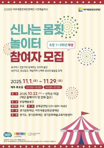 '신나는 서커스 예술놀이터'는 초등 1~3학년 어린이들을 대상으로 진행되는 문화예술교육으로 경기문화재단의 공모사업인 '2025 노는 예술, 더하기 지원 사업' 지원, 선정되어 5,000,000원의 보조금을 확보했다.