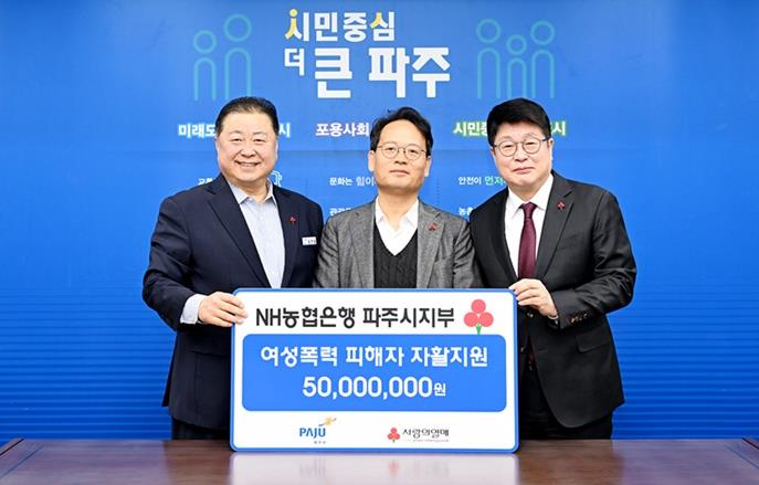 [뉴스앤톡] 파주시는 지난 11일 엔에이치(NH)농협은행 파주시지부가 여성폭력 피해자의 자립과 회복을 지원하기 위한 후원금 5천만 원을 기탁했다고 밝혔다.