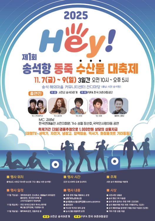 [뉴스앤톡] 서천군 마서면 송석어촌계가 11월 7일부터 9일까지 사흘간 송석항 일원에서 ‘제1회 헤이(HEY) 송석항 동죽 수산물 대축제’를 연다.