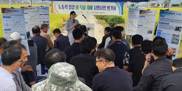 [뉴스앤톡] 서천군농업기술센터는 지난 2일 서천군 화양면 고마리 일원에서 벼농사 생력화와 저탄소 농업실천 확대를 위한 ‘벼 직파재배 현장 평가회’를 개최했다.