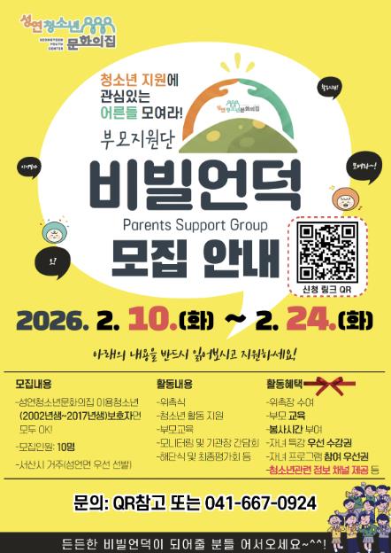 [뉴스앤톡] 성연청소년문화의집은 2026년 한 해 동안 지역 청소년의 건강한 성장과 안정적인 발달을 지원하기 위해, 청소년 보호자를 대상으로 부모지원단 ‘비빌언덕’ 참여자를 2월 10일부터 2월 24일까지 모집한다고 밝혔다.