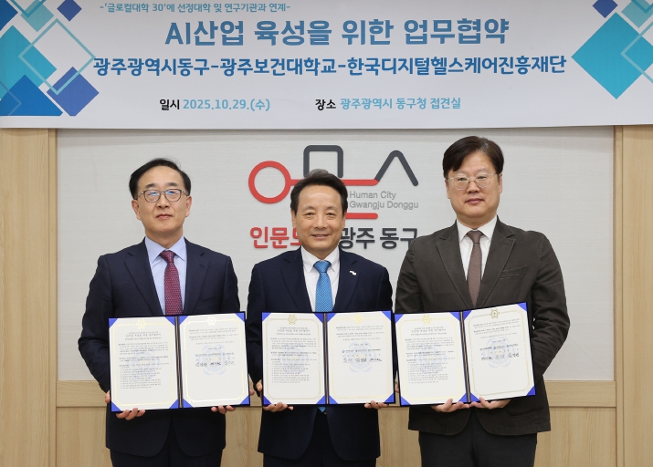[뉴스앤톡] 광주 동구는 지난 29일 구청 접견실에서 광주보건대학교(총장 김경태), 한국디지털헬스케어진흥재단(원장 박기원)과 인공지능(AI) 헬스케어 산업 육성, 인구 감소 해결, 원도심 활성화를 위한 업무협약을 체결했다고 밝혔다.