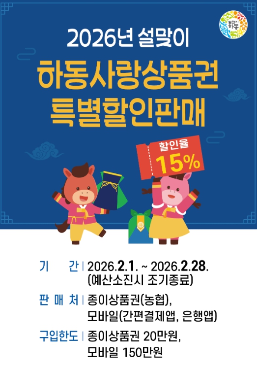[뉴스앤톡] 하동군은 설 명절을 맞아 지역 내 소비를 촉진하고 소상공인의 매출 증대를 도모하기 위해 '2026년 설맞이 하동사랑상품권 특별할인판매'를 실시한다고 밝혔다.