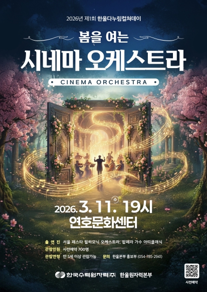 [뉴스앤톡] 한국수력원자력(주) 한울원자력본부는 3월 11일 19시 울진군 연호문화센터에서 제1회 한울다누림컬쳐데이 '봄을 여는 시네마 오케스트라'를 개최한다.