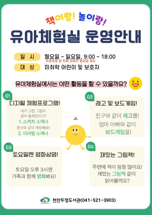 [뉴스앤톡] 천안시 두정도서관은 미취학 아동을 위한 ‘놀이 기반 독서 환경’인 유아체험실을 운영해 주민들로부터 호응을 얻고 있다고 12일 밝혔다.