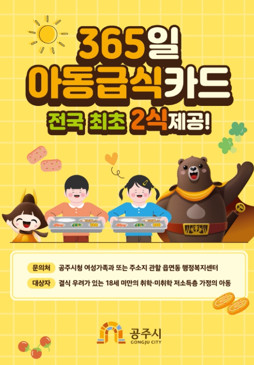 공주시는 자체 사업으로 연중 365일 아동급식카드 1식을 추가 지원하는 체계를 구축해 기존 지원의 한계를 보완하고, 결식 사각지대를 최소화하는 데 주력할 방침이다.
