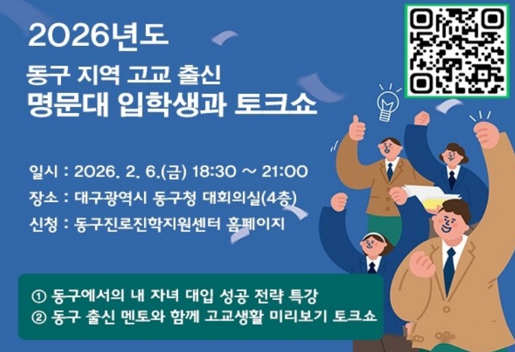 [뉴스앤톡] 대구 동구청은 오는 6일 오후 6시 30분, 동구청 4층 대회의실에서 관내 학생 및 학부모를 대상으로 ‘2026 내 자녀 대입 성공 전략 특강 및 멘토와 함께 고교생활 미리보기 토크쇼’를 개최한다.