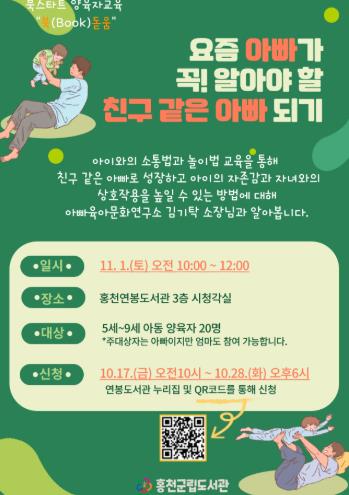 [뉴스앤톡] 홍천군립도서관은 지역 내 아동들과 양육자가 책으로 소통할 수 있는 북스타트 양육자 교육으로 '요즘 아빠가 꼭! 알아야 할 친구 같은 아빠 되기'를 연봉도서관에서 11월 01일 오전 10시에 진행한다.