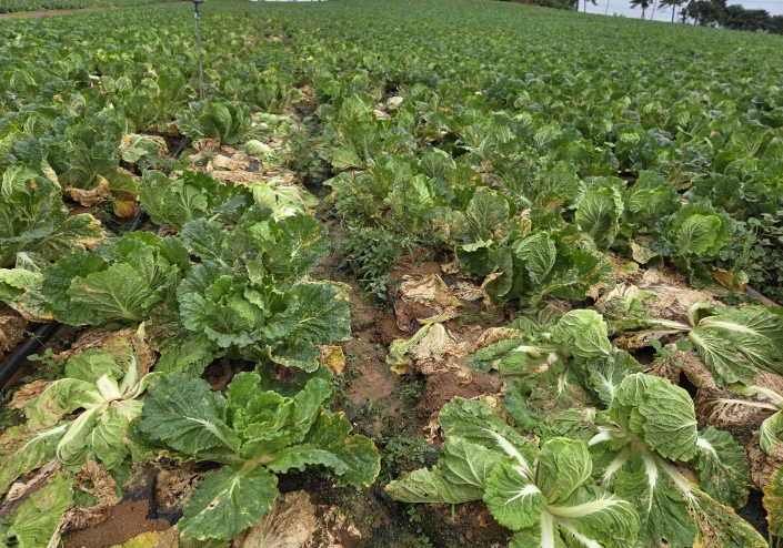특히 배추 무름병과 노균병은 과습한 환경과 배수 불량이 주요 원인으로 꼽힌다. 노균병은 잎에 회녹색반점이 생기며 점차 황화되고, 심하면 잎이 마르거나 포장 전체가 누렇게 변색되어 상품성이 떨어진다. 무름병은 초기에는 일부 식물체에만 국한되지만 결구기 피해 시 결구가 불량하거나 속이 썩어 상품가치가 떨어진다.