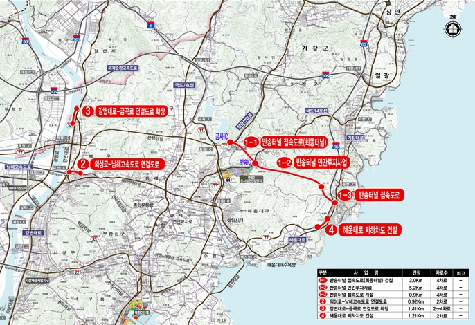 4개 사업은 총 6천539억 원 규모로, ▲반송터널 ▲의성로~남해고속도로 연결도로 ▲강변대로~금곡로 연결도로 확장 ▲해운대로 지하차도 건설 사업이다.