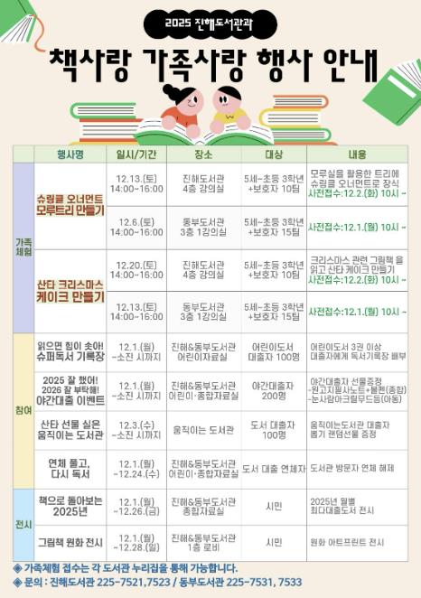 [뉴스앤톡] 창원특례시 진해도서관과는 연말을 맞아 가족과 함께 즐길 수 있는 따뜻하고 풍성한 ‘2025 책사랑 가족사랑 행사’를 진해도서관 및 동부도서관에서 12월 한 달간 운영한다.