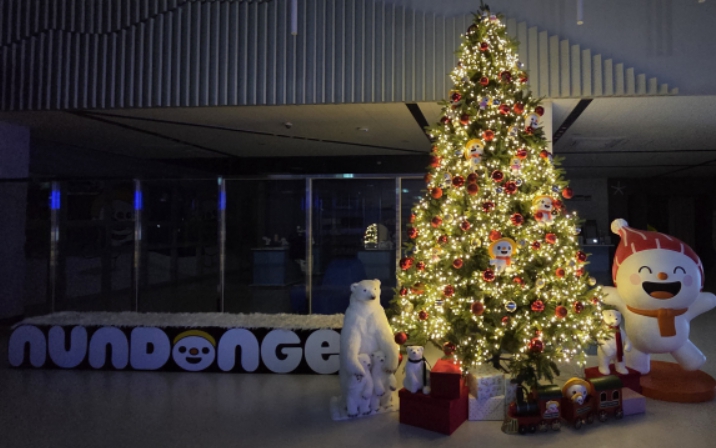 트리는 빨간·골드 오너먼트와 평창군 마스코트 ‘눈동이’로 꾸며졌으며, 북극곰 인형과 기차 모형을 활용한 포토존도 마련했다.