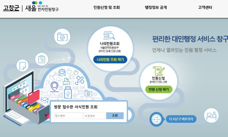 이에 따라 주민들은 고창군청 홈페이지 내 새올전자민원창구에 접속해 생활 불편, 도로‧교통, 환경 등 단순 민원과 일반 질의‧건의성 민원을 신청할 수 있다.