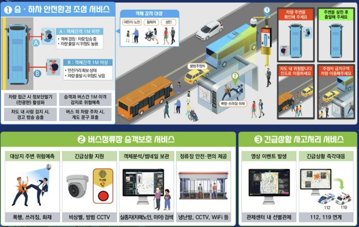 ‘인공지능(AI) 안심승하차 시스템’은 지능형 영상 분석 기술을 활용해 버스와 승객 간 거리를 실시간으로 분석하고, 위험 상황이 발생하면 전광판과 음성 안내를 통해 운전자에게 경고를 제공함으로써 승하차 사고를 사전에 예방하는 것이 핵심이다.
