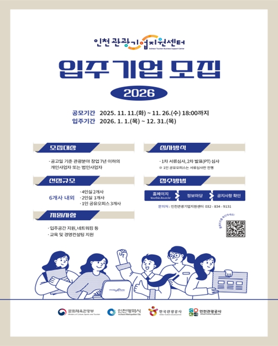 [뉴스앤톡] 인천광역시와 인천관광공사는 관광산업의 혁신과 성장을 견인할 2026년 인천관광기업지원센터 신규 입주기업을 11일부터 26일까지 공개 모집한다고 밝혔다.