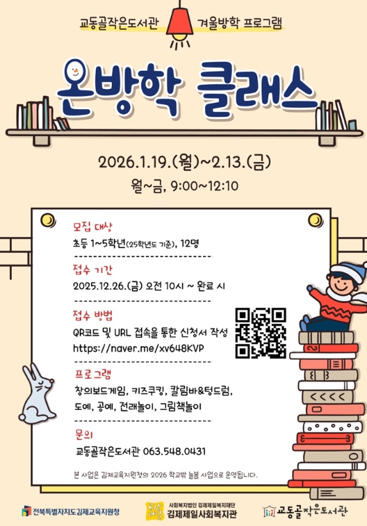 [뉴스앤톡] 김제시는 교동골작은도서관이 겨울방학을 맞아 아동을 위한 특별 프로그램인 ‘온(溫)방학 클래스’를 운영한다고 밝혔다.