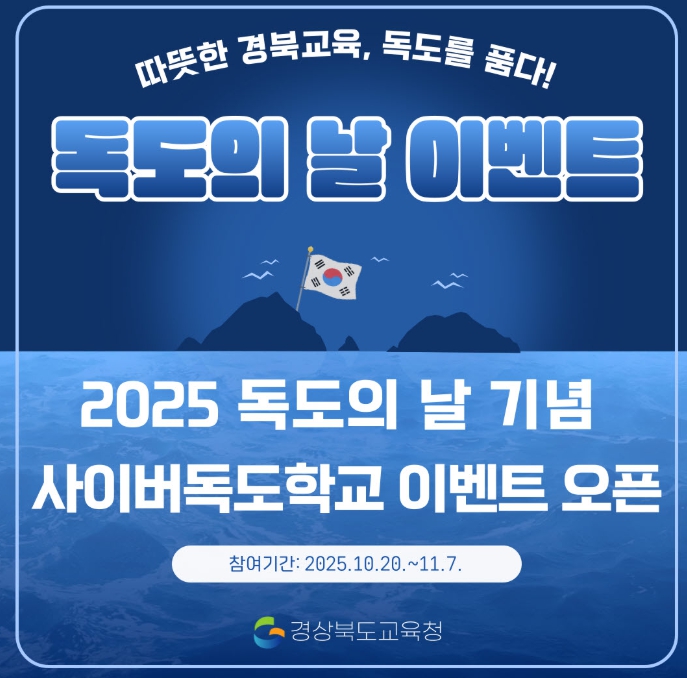 [뉴스앤톡] 경북교육청은 독도의 날(10월 25일)을 맞아 20일부터 다음 달 7일까지 3주간, 전 국민이 참여할 수 있는 ‘2025 독도의 날 기념 독도사랑 온라인 축제’를 운영한다고 밝혔다.