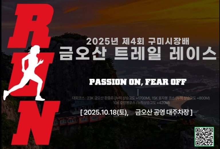 대회는 오전 7시 30분금오산 대주차장에서 개회식을 시작으로 △23km 금오산 환종주코스(형곡전망대-도수령-현월봉-환경연수원-금오산공영대주차장) △15KM 효자봉 코스(형곡전망대-도수령-금오산공영대주차장)△10KM 효령봉코스(형곡전망대-금오랜드-금오산공영대주차장) 세 구간으로 진행된다. 울창한 숲과 계곡을 따라 이어지는 코스마다 가을 정취가 물씬 풍기며, 참가자들은 자연이 빚은 풍광 속에서 체력과 인내를 겨룰 예정이다.