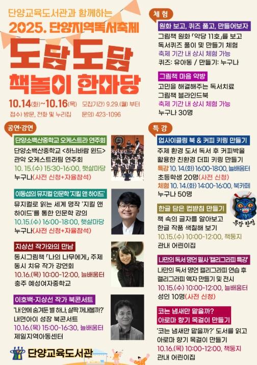 [뉴스앤톡] 단양교육지원청 단양교육도서관은 오는 10월 14일부터 16일까지 3일간, 학생·학부모와 지역주민이 함께 어울리는 '도담도담 책놀이 한마당' 독서축제를 개최한다.